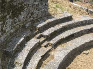 Das Odeon liegt heute nicht mehr – wie in meinem veralterten Reiseführer angekündigt – auf dem Gelände der Agora. Um zum Odeon zu gelangen, verlässt man die Agora und geht links die Straße entlang. Man kommt zuerst an einer linksseitig liegenden kleinen Kirche vorbei, dann an einer ebenfalls linksseitig liegenden Schule (ist recht einfach als Schule zu erkennen). Um diese Schule geht man links herum und kommt auf eine schmale Straße. Hier hält man sich wieder links und erreicht schon nach wenigen Metern das Odeon, das unterhalb des Straßenniveaus liegt. Ich bezweifle nicht, dass das Odeon ursprünglich auf dem weitläufigen Gelände der Agora zu finden war. Nur wurde wahrscheinlich im Laufe der Jahre das brachliegende Gelände zwischen Exedra und Odeon bebaut, so dass das Odeon heute „ausgelagert“ liegt. Zum Odeon an sich: Es soll sich aus Bauelementen aus griechischer und römischer Zeit zusammensetzen. Die vier Sitzreihen und die Treppenaufgänge sollen aus diesen Zeiten stammen. Das kleine Theater kann problemlos auch aus der Nähe besichtigt werden. Man muss nur ein wenig runterklettern. Mir gefiel’s sehr gut.