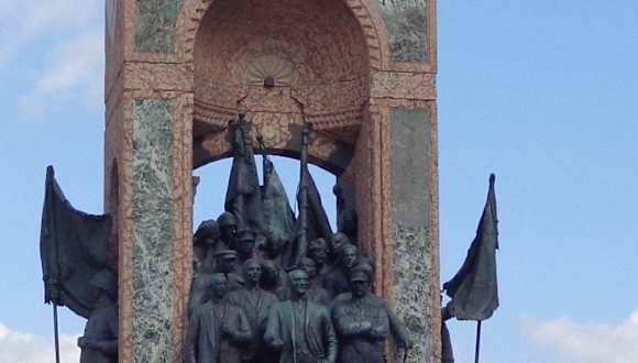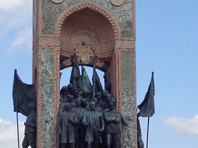 Das Denkmal der Republik steht mitten auf dem Taksim Platz , dem modernem Teil von Istanbul. Es wurde nach zweijähriger Bauzeit 1928 eingeweiht und zwar zu Ehren des ersten Präsidenten Kemal Atatürk. Das Monument ist elf Meter hoch und zeigt den Staatsmann Atatürk mit seinen Mitstreitern. Es ist ein“ Hingucker „ auf dem Taksim Platz an dem man auch schon mal verweilt. Es ist um zäumt und mit einer kleinen Grünfläche umgeben.