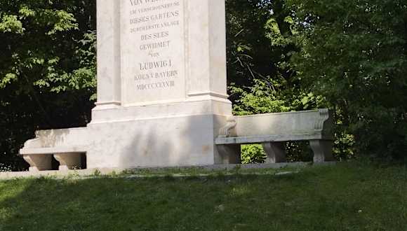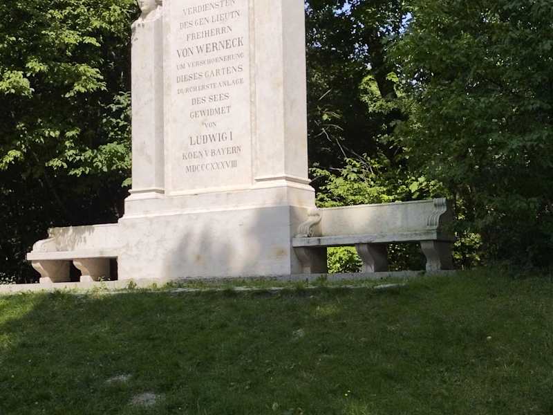 Bei unserem Spaziergang im Englischen Garten kamen wir auch beim Denkmal für Reinhard Freiherr von Werneck (1757 – 1842) vorbei. Das Denkmal befindet sich in unmittelbarer Nähe vom Restaurant Seehaus. Reinhard Freiherr von Werneck war sechs Jahre lang von 1798 – 1803 Direktor des Englischen Gartens in München und er war auch ein bayerischer Generalleutnant. Der Freiherr hat ab 1800 den Kleinhesseloher See im südlichen Teil des Englischen Gartens angelegt. Von 1807 bis 1812 erweiterte Friedrich Ludwig Sckell den See um mehr als das Doppelte auf seine heutige Größe. Der Kleinhesseloher See ist überall sehr flach. In dem 8,64 Hektar großen Gewässer liegen drei Inseln. Die Inseln im See heißen Königsinsel, Kurfürsteninsel und Regenteninsel. Für den Direktor des Englischen Garten und Offizier Reinhard Freiherr von Werneck (1757-1842) wurde bereits zu Lebzeiten - im Jahr 1838 – im Auftrag von König Ludwig ein Denkmal errichtet. Sein Verdient wird auch in der Inschrift des Denkmals erwähnt: Den Verdiensten des Gen.Lieutn. Freiherrn von Werneck Um Verschoenerung dieses Gartens durch erste Anlage des Sees gewidmet von Ludwig I. Koen. v. Bayern MDCCCXXXVIII. Das Denkmal ist über sechs Meter hoch und wird von Sitzbänken flankiert. Nach seiner Zeit als Direktor des Englischen Garten im Jahr 1803 war Freiherr von Werneck noch einige Jahre im Militärdienst als Kommandant des Kadettenkorps tätig. Ein interessantes Denkmal im Englischen Garten.