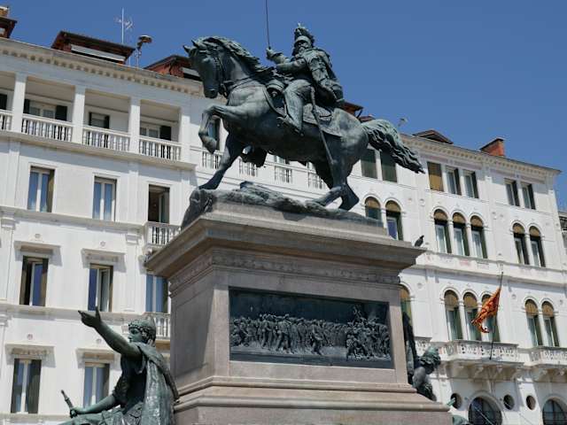 Dieses Denkmal steht auf der Riva degli Schiavoni, nicht weit entfernt von der Piazza San Marco. In jungen Jahren war er König von Sardinien + Piemont. Später wurde er König von Italien ab 1861. An der Vorder und Hinterseite des Denkmals sind Frauen angebracht. Viele Besucher sind völlig desinteressiert, schlendern weiter, auch weil am Denkmal keine Hinweistafel mit englischer und deutscher Sprache zu finden ist. Er war derjenige, der die damalige Herrschaft der Österreicher abschütteln wollte. Diese Herrschaft wurde vom Franzosenkaiser Napoleon auf das obere Italien übergestülpt. Somit erklärte er den Österreichern den ersten Unabhängigkeitskrieg, den er leider bei Novara verlor. Es gab noch den 2. Krieg gegen dieses Land, aber auch hier siegte er nicht. Im 3. Krieg gegen Österreich gewann er die Herrschaft, somit gilt er in den Augen der Italiener als Vater des Ital. Nationalstaat.