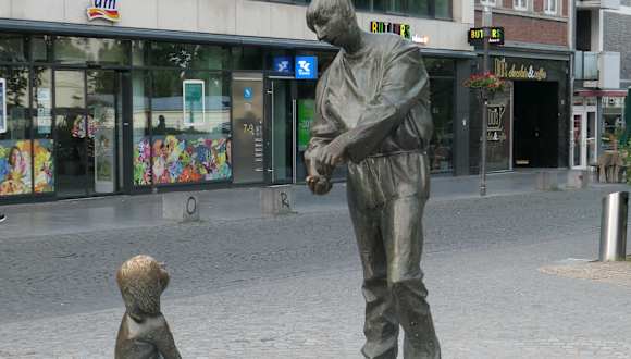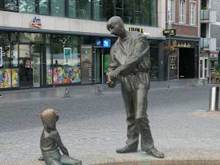 Gleich am Ende des Elisengartens, aber doch in der Innenstadt, liegt dieser Brunnen. Von den Aachenern wird er einfach "Geldbrunnen" genannt. Dieses nachdenkliche Rund mit Wasser und den darauf befindlichen Figuren,kann von jedermann/ pardon auch frau, unterschiedlich betrachtet werden. Da ist der Vater mit seinem Kind, welches um ein Eis bittet, jedoch die Mine des Mannes ist mehr bedrückt, er zählt zwar sein Geld,welches aber noch für Lebensmittel reichen muß, also bedauert er sein Kind, was ihn sehr leidend macht. Der Bettler braucht jetzt dringend Geld, denn sein "Durst" ist so groß, er braucht jetzt wieder einen Wein ! Deshalb diese unterwürfige Szene. Anders ist es bei dem Trio, die Frau fordert vom Mann ihr kleines Haushaltsgeld, er aber steht unter dem Druck, des feinen Herrn in bester Kleidung, der hinterrücks sein Geld einfordert. Also entweder ein Geldverleiher, oder jemand der seine Miete einfordert, eine ganz böse Situation. So wie ich hörte, hat die Aachener Sparkasse den Brunnen finaziert.