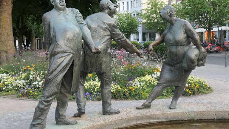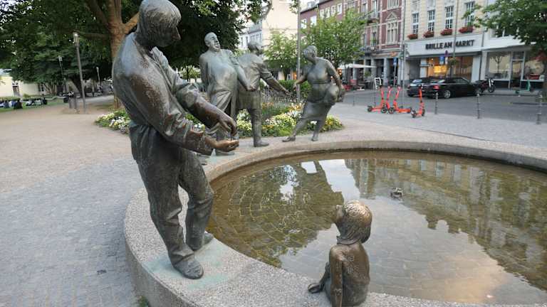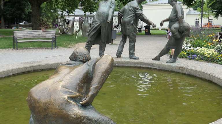 Am Brunnen „Kreislauf des Geldes“ bleibt man auf den ersten Blick etwas ratlos – die vom Bildhauer Karl-Henning Seemann 1976 geschaffene Plastik mit ihren Bronzefiguren ist nämlich nicht unbedingt selbsterklärend. Aufgeteilt in drei verschiedene Sektionen stehen am Brunnenrand Figuren, die symbolisch mit dem Begriff „Geld“ verbunden sind. Als erstes fällt ein älterer Mann auf, der über dem Wasser in gebückter und durchaus verzweifelter Haltung die Hand aufhält - trockenen Fußes wird er an dieser Stelle wohl kaum Almosen erwarten dürfen. Vielleicht versucht er allerdings auch nur, ins Wasser gefallenes Geld wieder zu erlangen. Eine weitere Figurengruppe besteht aus einem Mann mit Kind, welches unbeschwert mit den Beinen im Brunnenwasser baumelt und die „Auszahlungsgeste“ des Erwachsenen beobachtet. Rätselhaft bleiben die drei Figuren, von denen zwei ein Geschäft „hinter dem Rücken“ tätigen, während die Dame des Trios einen Sack trägt. Gier, Geiz und Gönnerhaftigkeit sollen damit verkörpert werden. Interessant ist die kreisende Wasserbewegung im Brunnenbecken, die in der Mitte sogar einen kleinen Strudel erzeugt und darüber hinaus die Tatsache, dass dieses Kunstwerk von warmem Thermalwasser gespeist wird und somit auch im tiefsten Winter in Bewegung bleibt.