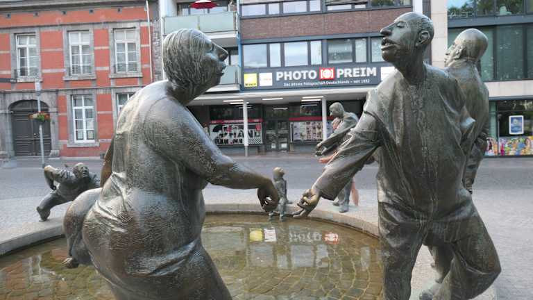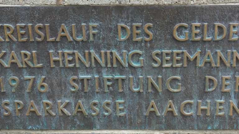 Aachen ist seit der Zeit der Römer bekannt für seine Thermalquellen, und das heutige Stadtbild wirkt geprägt von den zahlreichen Brunnen mit Denkmälern unterschiedlichster Art. Auch der „Kreislauf des Geldes“ ist eines dieser Brunnendenkmäler, das in verschiedenen Bildern darstellt, wie Geld „die Runde macht“. Sehr originell!