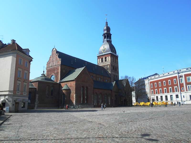 Der Domplatz ist der größte Platz der Stadt und wurde Ende des 19. Jahrhundert angelegt. Im 19. und 20. Jahrhundert wurden rund um den Platz einige bedeutende und wunderschöne Gebäude errichtet, die heute das Gesicht des Platzes prägen. Eines dieser Gebäude ist der neoklassische Bau, der für die Rigaer Kommerzbank errichtet wurde und heute den Radiosender "Latvijas Radio" beherbergt. Auf dem Platz ist eine Stelle markiert, von der aus man alle drei vergoldeten Hähne auf den großen Kirchen der Altstadt sehen kann.