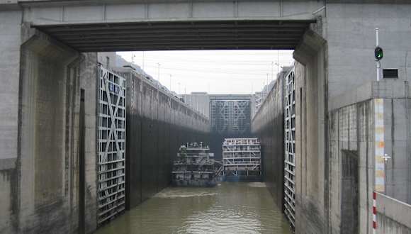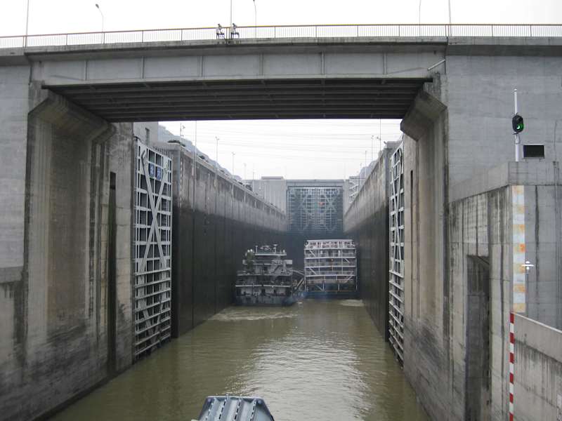 Nachdem wir die 5 Schleusen des Dreischluchten-Staudammes gegen 6 Uhr passiert hatten, mussten wir noch bis gegen 8.30 Uhr auf unserem Kreuzfahrtschiff M.S. Blue Whale warten, bis wir bei dem kleinen Ort Sandouping an Land gehen konnten. Dort wartete ein Bus mit einer örtlichen Reiseleiterin (die aber nur Englisch sprach) auf uns und wir fuhren auf das bewachte Gelände des Staudammes. Wir durften dieses Gebiet erst betreten, nachdem unsere Taschen und Rucksäcke durchleuchtet worden waren. Wir besichtigten die große Staumauer und das Schiffshebewerk für kleinere Schiffe, das 2014 fertig werden soll. Danach sahen wir in einer Halle das Modell des gesamten Projektes. Von einem kleinen Hügel hatte man einen ausgezeichneten Überbick über die Schleusen, die mit mehreren Schiffen belegt waren. Gegen 11 Uhr fuhren wir zurück zu unserem Schiff. Wir fuhren dann durch die 3. und letzte Schlucht, die Xiling-Schlucht. Gegen 13.30 Uhr schifften wir bei Yichang (40 km vom Staudamm entfernt) aus. Die sehr interessante Yangtse-Kreuzfahrt war zu Ende.
