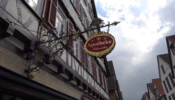 Das Gebäude hat eine lange Vergangenheit mit vielen Besitzerwechseln. 1574 erbaute es Ulrich Batzlin, später Melchior Enßlin, später Theophilius Hermann. Weitere Besitzer folgten. 1788 wurde es durch Jakob Friedrich Currlin als "Obere Apotheke" geführt. Die Apotheke ist ein Beispiel der vielen freigelegten Fachwerk-Bürgerhäuser der Stadt. Das Haus ist heute eine moderne Apotheke.