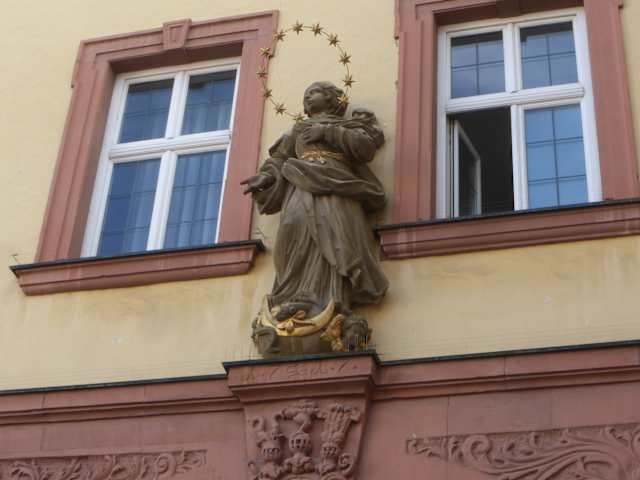 In Karlstadt befindet sich an der südwestlichen Ecke vom Marktplatz ein repräsentatives Gebäude (Marktplatz 8). Dieses Gebäude wurde 1717 als Erweiterungsbau der fürstbischöflichen Amtskellerei im barocken Stil errichtet. Nach der Säkularisierung ging dieses Gebäude an Bayern und wurde als Landgericht und königliches Bezirksamt genutzt. Heute befindet sich in diesem Bauwerk das Landratsamt. Oben am Prunkportal an der rechten Seite des Gebäudes ist das Wappen des Würzburger Fürstbischofs Johann Philipp von Greiffenklau-Vollraths eingelassen (geboren 1652 in Amorbach, ab 1699 Fürstbischof von Würzburg, gestorben 1719 in Würzburg). Über dem Portal mit dem Wappen befindet sich eine schöne Statue der „Maria Immaculata“ (der vom „ersten Augenblick ihres Daseins“ von der Erbsünde befreiten und damit reinen und ohne Schuld / ohne Sünde gezeugten Gottesmutter). Maria ist ohne Kind dargestellt, sie steht auf der Mondsichel und zertritt den Kopf der Schlange, um den Kopf von Maria ist ein Sternenkranz, bestehend aus 12 goldenen Sternen. ACHTUNG: dieses Gebäude nicht mit der ehemaligen Fürstbischöflichen Amtskellerei in der Hauptstraße verwechseln.