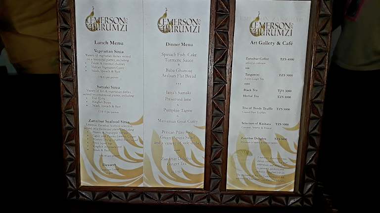 Das Emerson on Hurumzi Art Gallery & Café befindet sich mitten in Stonetown neben dem Princess Salme Museum und verfügt ebenfalls über eine Dachterrasse. Diese ist allerdings in der Nebensaison tagsüber geschlossen. In der Nebensaison wird ein Dinner Menü zum Sonnenuntergang angeboten. Es gibt nur sehr wenige Plätze und muss daher vorbestellt und bei Bestellung schon bezahlt werden. Mit 40 $ ist das Preis/Leistungsverhältnis nicht so gut. Eine gute und günstigere Alternative ist das Maru Maru Terrace Restaurant nur ein paar Meter weiter.