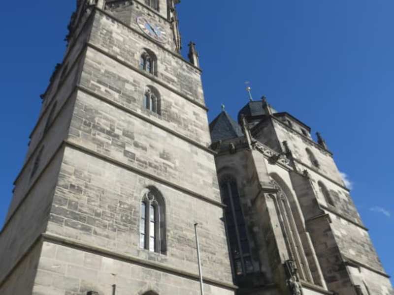 Die evangelische Moriz-Kirche ist die älteste Kirche von Coburg und hat ihren Ursprung in einer romanischen Basilika aus dem 13. Jahrhundert. Eine erste urkundliche Erwähnung des Namens St. Moriz für diese Kirche stammt aus dem Anfang des 14. Jahrhunderts. Dieser Name bezieht sich auf den Heiligen Mauritius, der zugleich der Schutzheilige von Coburg ist. Mauritius stammte angeblich aus Nordafrika und er war der Überlieferung nach der Kommandeur der christlichen, thebäischen Legion, die im Dienste des römischen Kaisers Maximian stand. Der Sage nach weigerten sich Mauritius und seine Mannen gegen ihre christlichen Glaubensbrüder und -schwestern in der heutigen Schweiz zu kämpfen, woraufhin der Kaiser die völlige Vernichtung dieser christlichen Legion befahl. Wie die Sage weiter besagt, erfolgte die Vernichtung der Legion um das Jahr 290 in der heutigen französischsprachigen Schweiz. Mauritius, seine Offiziere und selbst die einfachen Soldaten ließen sich demnach ohne Gegenwehr hinrichten. Der Mohrenkopf, den man in Coburg überall vorfindet und der sich auch im Stadtwappen von Coburg befindet, stellt ebenfalls den Heiligen Mauritius dar. Wenn man am Kirchhof, vor der St.-Moriz-Kirche steht und zur Kirche blickt, so kann man sehen, dass die beiden Türme unterschiedliche Höhen haben. Der vom Betrachter aus gesehene linke Turm ist ca. 72 Meter hoch (an diesem Turm befindet auf der Höhe vom Erdgeschoss eine Figur des Heiligen Christophorus), Der rechte Turm ist ca. 42 Meter hoch (an diesem Turm befindet sich eine Figur vom Heiligen Nikolaus). Zwischen diesen beiden Türmen ist der fein gestaltete Mittelbau mit dem Hauptportal. Am Hauptportal sind links die Statuen von Maria mit dem Jesuskind auf dem Arm, daneben die Heilige Barbara. Auf der rechten Seite vom Hauptportal stehen Adam und Eva (Adam und Eva halten jeweils einen Apfel in der Hand, in Coburg wird aber gesagt, dies seien natürlich keine Äpfel, sondern Coburger Klöße). Über dem Hauptportal ist ein Balkon. Auf der linken Seite von diesem Balkon steht die Staute des Heiligen Mauritius, der eine Lanze in der Hand hält (wie bereits oben erwähnt, ist Mauritius der Namensgeber dieser Kirche und der Schutzheilige von Coburg). Auf der rechten Seite vom Balkon steht der Heilige Petrus mit Buch und Schlüssel in der Hand. In der großen Hallenkirche findet man diverse Grabplatten, ein schönes Fresko, den farbigen Taufstein von 1539, die Kanzel, die doppelstöckige Empore, die Orgel auf der Empore, die Fürstenloge, eine Büste von Martin Luther, den modernen Altar aus Ahornholz (der aus 5 beweglichen Teilen besteht und so immer wieder verändert werden kann) usw. ABER DIE HAUPTSEHENSWÜRDIGKEIT IN / VON ST. MORIZ IST DAS GROSSE, BEEINDRUCKENDE EPITAPH, welches Herzog Johann Casimir von Sachsen-Coburg zwischen 1594 und 1598 für seine Eltern Johann Friedrich II. (Johann Friedrich der Mittlere) und Elisabeth von der Pfalz errichten ließ. Johann Friedrich II. wurde 1567 inhaftiert und musste den Rest seines Lebens in Haft verbringen, überwiegend in bzw. bei Wien. Seine Frau Elisabeth begab sich 1572 freiwillig in Haft, damit sie bei ihrem Mann sein konnte (sie starb 1594 in Wien). Johann Friedrich II. wurde Anfang 1595 von Wien nach Schloss Lamberg in der Steiermark verlegt, wo er im Mai 1595 nach 28 Jahren Haft starb. Das Alabaster-Epitaph ist reich gegliedert. Es ist fast 14 Meter hoch und ca. 6,5 Meter breit. Es gehört zu den schönsten Renaissance-Epitaphen Deutschlands. In der Mitte des Epitaphs ist eine Figurengruppe, die die fürstliche Familie darstellt. In der Mitte dieser Figurengruppe kniet Herzog Johann Friedrich II. (der Mittlere), ihm gegenüber steht seine erste Frau Agnes von Hessen und seine zweite Frau Elisabeth von der Pfalz. Hinter dem Herzog sind vier männliche Figuren; die beiden kleinen Figuren stellen seine im Kindesalter verstorbenen Söhne Johann Friedrich und Friedrich Heinrich dar, hinter diesen stehen zwei große Figuren, die die erwachsenen Söhne Johann Casimir und Johann Ernst darstellen. Hinter dieser fürstlichen Gruppe ist ein Relief, welches die Überführung der Gebeine von Patriarch Joseph in das biblische Land Kanaan darstellt. Über diesem Relief ist ein weiteres Relief mit der Kreuzigungsszene. Über diesem kann man die Grablegung Jesus sehen. Ganz oben auf dem Epitaph steht der auferstandene Jesus, der als Sieger den Tod dargestellt ist. Ansonsten sind noch diverse andere Figuren, sowie diverse Wappen und sonstige Verzierungen an diesem Epitaph, die man sich auch näher anschauen sollte. Vor dem Epitaph befanden sich einst die Särge der Fürsten von Coburg, jedoch wurden diese 1687 von hier entfernt und in die Gruft gebracht, die sich unter dem Chorraum befindet. MEIN TIPP: wenn Sie die Möglichkeit zur Teilnahme an einer Kirchenführung haben, so sollten Sie dies unbedingt wahrnehmen. Wir konnten eine sehr lohnenswerte Kirchenführung mitmachen. Es wurden dabei interessante Informationen über die Kirche im Allgemeinen und über das Epitaph im Besonderen vermittelt.