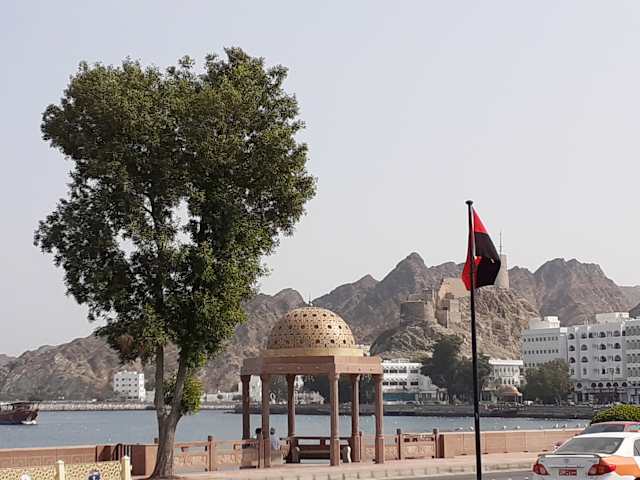 Die Festung Mutrah liegt etwas näher an der Stadt als die beiden anderen, von den Portugiesen errichteten Festungen Al Jalali und Al Mirani, die näher an der Hafeneinfahrt stehen. Gemeinsam hatten sie jedoch den Zweck, die von den Portugiesen beanspruchte Vormachtstellung im Seiden- und Gewürzhandel vor Eindringlingen zu schützen. Wir konnten bei unserem Besuch aus Zeitgründen die Festung nur von außen besichtigen. Nach Angaben des Reiseleiters soll es jedoch nach seiner militärischen Nutzung nun wieder möglich sein, die Festung zu besuchen.
