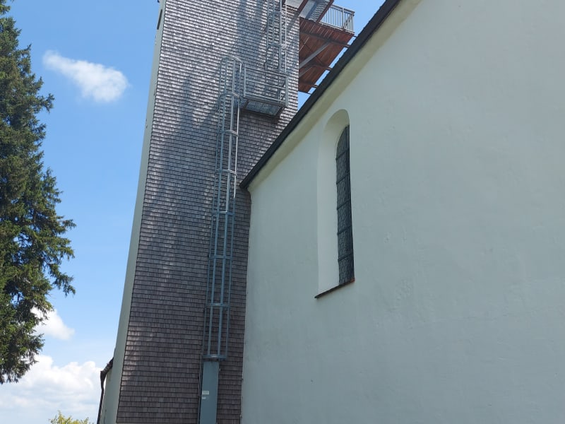 Die Kirche ist zwar sehr klein, aber sehr schön. Über eine sehr steile schmale Treppe, vorbei an der sehr lauten Glocke, erreicht man eine super schöne Aussichtsplattform, wo man den gesamten Auerberg überblicken kann.