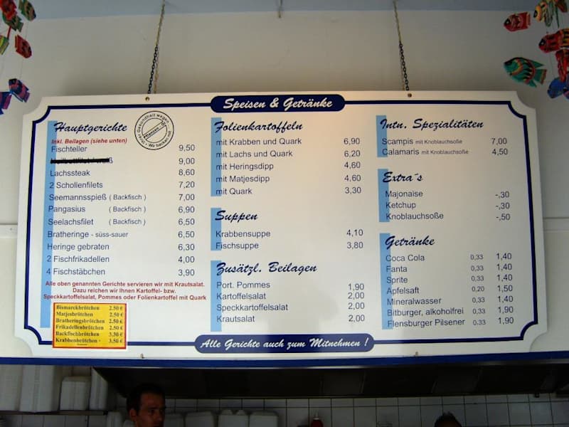 Dieses Jahr waren wir 3x beim Fisch-Imbiß und haben jedes Mal Backfisch (2 Stck. Seelachs) mit unterschiedlichen Beilagen (Pommes, Backkartoffel (lecker Quark dazu!), Speck-Kartoffelsalat oder Mayonaisen-Kartoffelsalat) für 6,90 € gegessen. Der Fisch schmeckt klasse, da die Panade nur sehr dünn ist. Schade ist nur, dass es zwar Knobi-Sauce als Beilage gibt, aber keine Remoulade. Bei gutem Wetter kann man Holzbänken draußen sitzen, ansonsten an Stehtischen drinnen Essen.