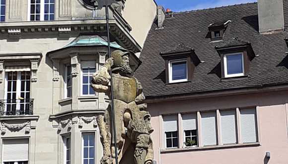 Dieser Brunnen ist in Mulhouse und er steht auf dem Place de la Reunion. Er ist mit einer Ritterfigur und einer Hellebarde gekrönt, diese sieht aus wie ein Speer, aber oben ist eine Klinge die schräg am Speer angebracht ist. Das ganze ist ein Nachbau eines Brunnens von 1572. Der Brunnen wurde im Jahr 1992 installiert, als man den Platz von einem Parkplatz in einen Fußgängerplatz umarbeitete. Dieser Platz soll die Historie der Stadt zeigen, denn auch das alte Rathaus liegt an diesem Platz.