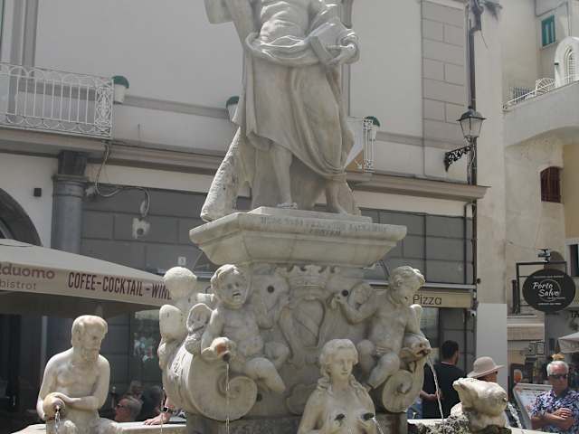 Der schönste Brunnen von Amalfi ist der Fontana di Sant‘Andrea. Bei den Brunnen Fontana di Sant`Andrea handelt es sich um einen symbolträchtigen Brunnen in der Altstadt von Amalfi. Der barocke Brunnen aus dem Jahr 1760 stand einst vor dem Dom, wurde aber später verlegt, um den Verkehr zu erleichtern. Heute befindet er sich in der Nähe der Treppe zur Kathedrale von Amalfi. Wie man im Internet nachlesen kann, wurde der Brunnen Fontana di Sant‘Andrea aus dem Jahr 1760 im Jahr 2018 restauriert. Es handelt sich um einen Skulpturenkomplex , mit der Darstellung einer Taube, die die Luft symbolisiert, eines Satyrs, der im Volksmund “Pulicano” genannt wird und dessen Gesichtszüge an einen Fischer aus Amalfi erinnern sollen, der die Erde symbolisiert, und einer Meerjungfrau in zentraler Position, die das Wasser symbolisiert. Ein Satyr ist in der griechischen Mythologie ein Dämon im Gefolge von Dionysos. Zu den kunstvollen Skulpturen des Brunnens gehören der heilige Andreas sowie Nymphen und Engel. Der Schutzpatron der Stadt ist in dem Meisterwerk neben vier Engeln, dem Fisch Pellicano und einer Taube dargestellt.