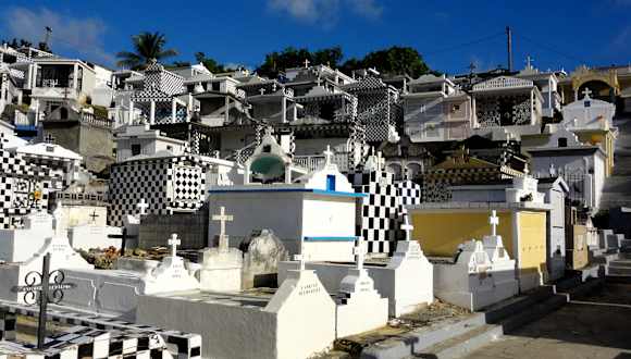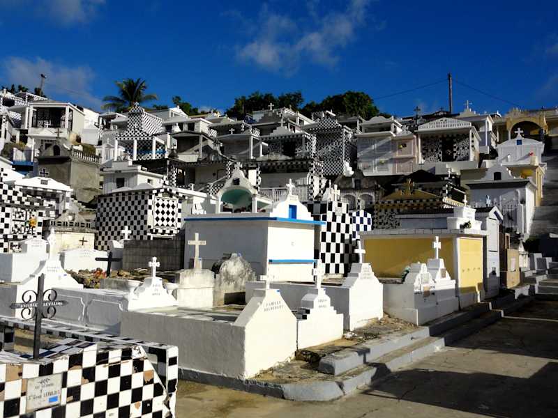 Auf dem Weg von Pointe-à-Pitre zur Nordspitze von Grand-Terre kommt man durch den kleinen Ort Morne-a-L´Eau und sieht in der Ortsmitte den wohl schönsten Friedhof der Insel: In einer Hanglage gruppieren sich hunderte von schwarz-weiß gefliesten Totenhäuschen etagenförmig in einem Halbrund – fast wie ein Dorf inmitten des Ortes. Die Häuschen sind zum Teil schon über 100 Jahre alt und entsprechen in ihrer Architektur den einfachen Landarbeiterhäusern mit einem Säulenvorbau und einer Art Veranda. Zu Allerheiligen findet alljährlich eine große Prozession statt und der Friedhof ist dann von unzähligen Kerzen erleuchtet. Bei der Durchreise durch Morne-a-L´Eau lohnt sich eine Pause, um diesen Ort in Ruhe wirken zu lassen.