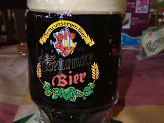 Unser Gastgeber hatte uns das Gasthaus "Talsperre" empfohlen. Dort gibt es ein XXL-Talperrenschnitzel, dass man unbedingt probieren sollte. Das Schnitzel reicht für zwei, so die Aussage unseres Vermieters. Also nichts wie hin. Wir bekamen die Menuekarte, aber wir wussten schon, was wir wollten: 1 XXL-Talsperrenschnitzel mit Kartoffelspalten, einen Dip und Salatbeilage für 18 €. Dazu bestellten wir ein je einen "Treuener Bock", ein Bier aus dem benachbarten Vogtland. Das Fleisch war super, es hat alles sehr gut geschmeckt und war nett angerichtet. Nach dem Essen kann man, nun nicht mehr hungrig, z, B. eine Wanderung um die Carlsfeld-Talsperre, die man von Gasthaus in weniger als 10 Minuten zu Fuß erreicht, starten.