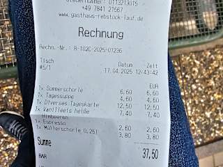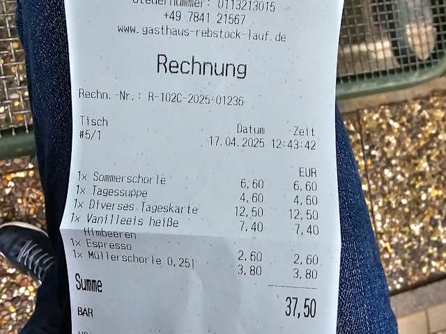 Besuch am Donnerstag, 17. April 2025 mittags Vorab meines Besuches habe ich kurz im Gasthaus angerufen, ob man für mittags reservieren muss und ich habe die Aussage erhalten, dass man einfach so vorbeikommen kann. Auf der dortigen Webseite des Gasthauses sind u.a. die Öffnungszeiten hinterlegt > speziell hier möchte ich ansprechen, dass es heisst, u.a. ab 11 Uhr geöffnet - vor Ort an der Eingangstüre und auch bei Google ist hier aber abweichend 11:30 Uhr hinterlegt. Der Schaukasten vor Ort an der Hofeinfahrt, ist nicht einladend gestaltet, da teilweise die Blätter ineinander gefallen sind, sodass man nicht mehr alles von der Speisekarte lesen kann, bzw. der Schaukasten meinem Eindruck nach, schon länger nicht mehr danach geschaut wurde - dies als Verbesserungsvorschlag meinerseits. Nach Eintritt im Gasthaus, kann man direkt in die Küche schauen und hier wurde ich durch die Chefin begrüßt - links davon geht es dann ins Gasthaus, wonach ich vom Chef begrüßt wurde und dieser mir die Tische zur Auswahl gegeben hat, ohne Reservierungsschild. Zum Zeitpunkt, nachdem ich mich an einen Tisch gesetzt hatte und wartete, war ein Stammgast im Gasthaus, mit welchem der Chef sich unterhalten hat. Währenddessen, hat der Chef, am dortigen Tisch das Teelicht angezündet, zu meinem Tisch hat dieser es dann leider nicht geschafft (schade) - wenn man Teelichter entsprechend anzündet, dann an allen Tischen wo auch Gäste sitzen. Im weiteren Verlauf nach ein paar Minuten des Wartens was passiert, hat der Chef dann seine Frau gerufen, dass doch Gäste (ich) im Gastraum sitzen, die auf die Karte warten, was aus meiner Sicht, doch auch der Chef hätte verteilen können. Die Chefin kam und übergab mir die Klemm-Speisekarte und gab an, dass das heutige Tagesessen > Gulasch, mit Nudeln und einem Beilagensalat wäre und fragte darüber hinaus erste Getränkewünsche ab. Das Gasthaus zum Rebstock in Lauf, gibt es bereits seit 1813 im Familienbesitz und ist ein altes Fachwerkhaus, welches aus meinem Empfinden, stimmig war, mit der dort angebotenen deutschen regionalen Küche. Im Laufe der nachfolgenden aufgenommenen Bestellung, habe ich dann noch den Preis für das Tagesessen erfragt, da man dies aus der Karte oder sonstigen Aufstellern nicht erfährt. Bestellung: > Aperitif: Sommerschorle 0,25l für 6,60 € > Suppen: Tagessuppe >> auf Anfrage >> Spargelcremesuppe für 4,60 € > Tagesgericht >> Gulasch, Nudeln, Salat für 12,50 € > Badische Weine: Müllerschorle 0,25l für 3,80 € > Eis: Vanilleeis heiße Himbeeren mit Sahne für 7,40 € > Warme Getränke: Espresso für 2,60 € Zusammenfassung: Service: + Chefin war sehr freundlich, hat mich umgehend nach Beginn nach dem Tagesgericht informiert - hier könnte man zusätzlich den Preis erwähnen. - nicht angezündetes Teelicht, obwohl dies bei einem anderen Tisch durchgeführt wurde > dies macht einen etwas abwertenden Eindruck Speisen: +/- grundsätzlich gut, allerdings bei der Spargelcremesuppe waren überhaupt keine Spargelstückchen enthalten, was ich persönlich schade fand + Gulasch war gut und hatte eine leckere braune Sauce ++ beim Vanilleeis waren die heißen Himbeeren extra serviert - gute alte Schule :-) Preis-/Leistung: ++ für das erhaltene, kann man nur sagen, dass dies unterhalb des preislichen Mittelwertes angeboten war. Ambiente: - der Schaukasten am Eingang sollte man schöner gestalten + im Innern, genau so wie ich es erwartet hatte *********************************************************** Das Gasthaus zum Rebstock, passt gut in die Ortschaft Lauf im Schwarzwald, da es die Tradition und den familiären Flair widerspiegelt. Gerne wieder... wünsche den Betreibern alles Gute und bleiben Sie gesund.