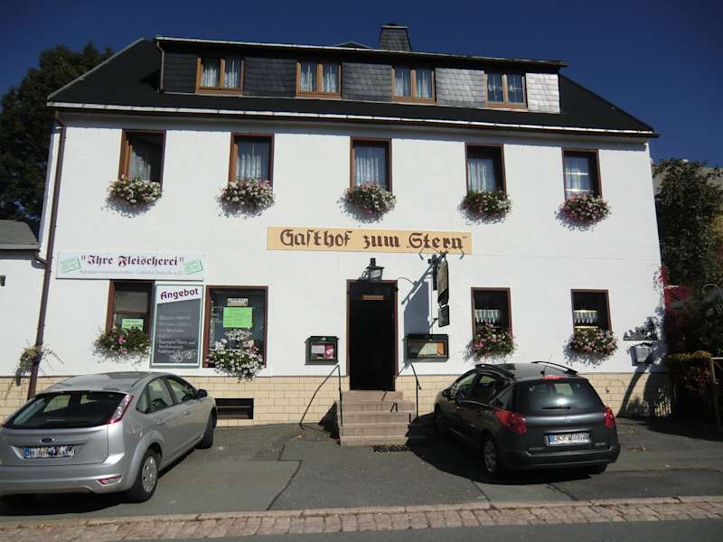 Wir hatten die Köhlerei bei Sosa besucht und es war Mittagszeit. Auf der Rücktour entdeckten wir in Sosa den Gasthof "Zum Stern". Im gleichen Haus befindet sich eine Fleischerei. Wir entschlossen unseinzukehren und wurden nicht enttäuscht. Die Bedienung war sehr freundlich und flott. Selbst als die Anzahl der Gäste sich sehr erhöhte , hatte sie alles im Griff. Wir bestellten Sauerbraten mit Pilzen, Rotkohl und Klößen, sowie eine Haxe mit Kraut und Klößen. Es schmeckte wirklich ausgezeichnet. Das Preis-Leistungsgefüge ist dort sehr gut. Außerordentlich gesättigt und zufrieden fuhren wir zum nächsten Highlight. Ein Besuch dort lohnt sich!