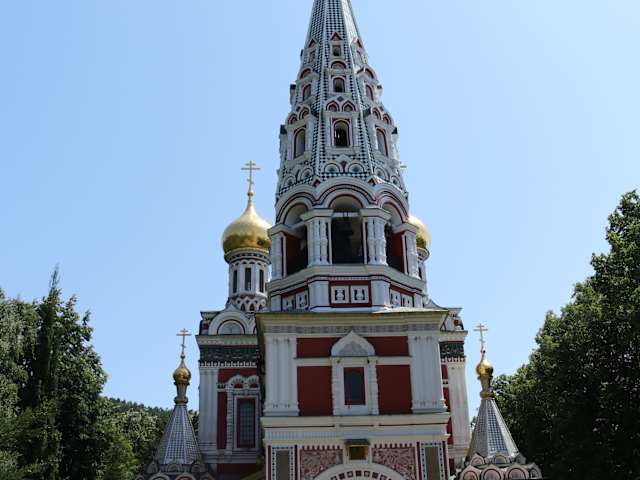 Die Gedächtniskirche "Christi Geburt" im Dorf Shipka wurde im Jahre 1902 im Baustil russischer Kirchen des 17. Jahrhunderts errichtet. Architekt war der Tscheche A.I. Tomischko. Die Kirche liegt in der Nähe des südlichen Ende des Shipkapasses, eine der wichtigsten Nord-Südverbindungen über das Balkangebirge. Die Kirche ist dem russischen Sieg in einer der wichtigsten Schlachten im russisch-türkischen Krieg (1877/78) gewidmet. Als Folge dieses Krieges wurde Bulgarien von der 482 Jahre andauernden osmanischen Fremdherrschaft (1396 - 1878) befreit. Der Glockenturm ist 53 Meter hoch und hat 17 Glocken. Die größte Glocke ist 12 Tonnen schwer. Im Inneren sieht man eine Altarwand aus Lindenholz und mit reichlich vergoldeten Ikonen. Auf den Marmorplatten befinden sich die Namen der gefallenen russischen Offiziere und Soldaten während des Russisch-türkischen Kriegs in goldenen Lettern geschrieben. Auf vier der Tafeln stehen die Namen der bulgarischen Kämpfer, die für die Befreiung Bulgariens von der türkischen Fremdherrschaft gefallen sind. In der Krypta sind 17 Sarkophage mit den Gebeinen russischer Soldaten aufgestellt.