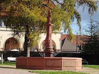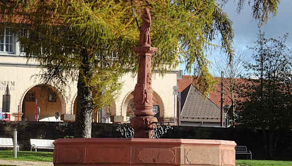 Der Brunnen am Unteren Marktplatz, trägt die Zeichen der Gerechtigkeit, deshalb auch sein Name. Die Brunnenfigur hat Verbundene Augen, Schwert und Waage. Erstellt wurde er 1766. Er besteht aus Buntsandstein aus dem Nordschwarzwald. Die Brunnensäule hat drei Stadtwappen und Fruchtgehänge. Die Brunneneinfassung ist zwölfeckig.