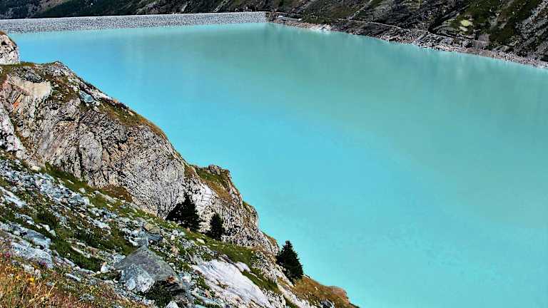 Gletscherhochtouren sind normalerweise nur mit entsprechender Ausrüstung (Seil, Pickel, Steigeisen) und Erfahrung oder mit einem Bergführer zu machen. Diese alpine Tour, die es erst seit 2014 gibt, verbindet die Bergstation der Felskinn-Seilbahn (Saas-Fee) mit dem Mattmarkgebiet (Saas-Almagell) und kann „ausnahmsweise“ von jedem Bergliebhaber, der über etwas Kondition und gutes Schuhwerk verfügt, bewältigt werden. Bei dem Gletscher-Trail werden drei Gletscher überquert (der Chessjen-, der Hohlaub- und der Allalingletscher); der Weg ist aber so gut markiert und präpariert, dass man in diesem Fall auf die oben erwähnte Ausrüstung verzichten kann. Gestartet wird an der Bergstation der Felskinnbahn, wo man gleich den Chessjengletscher in Richtung Egginerjoch (2989 m) betritt; der Weg ist gut gespurt und fast ohne Steigung. Der Blick auf den Alphubel (4206 m) und die Mischabelgruppe – Täschhorn (4490 m), Dom (4545 m) und Nadelhorn (4327 m) – ist überwältigend. Vom Joch aus geht es erstmal bergabwärts – die alte Trasse über den Gletscher ist wegen Steinschlaggefahr gesperrt (Erhöhung der Permafrostgrenze) – zu einem kleinen See, um dann wieder über glattgeschliffene Felsen und den Chessjengletscher zur Britannia Hütte hochzusteigen (3030 m, einmalig schön gelegen in der Gletscherwelt der Saaser Berge). Von der Hütte aus geht es dann in südlicher Richtung bergabwärts weiter; auf guter Pfadspur und später durch eine Menge Felsblöcke (etwas mühsam) erreicht man den Hohlaubgletscher, dessen Einstieg und Überquerung durch die perfekte Markierung und das Fehlen von Randspalten kein Problem darstellt. Über Geröllfelder, riesige Felsblöcke und eine Zwischenmoräne gelangt man – erst auf-, dann wieder abwärts – zum Allalingletscher ; die Überquerung dieses Gletschers ist auch recht unproblematisch. Unterwegs genießt man immer wieder einzigartige Panoramablicke auf das Strahlhorn (4190 m), das Rimpfischhorn (4199 m) und das Allalinhorn (4027 m) ; eine Gletscherkarusell der Extraklasse. Das letzte Drittel des Trails führt uns vom Allalingletscher hoch bis zum Schwarzbergchopf (2868 m), von wo aus man grandiose Tief- und Fernblicke auf den Mattmark Stausee, die Weissmies (4023 m) und das Lagginhorn (4010 m) hat. Ab hier geht es dann recht steil hinunter zur Schwarzbergalp (2373 m) – bei einigen exponierten Stellen ist Vorsicht geboten – und dann auf breiterem Bergweg weiter zum Staudamm des Mattmarksees (2197 m). Tipp: Erkundigen Sie sich im Voraus beim Verkehrsamt Saas-Fee, ob der Trail freigegeben wurde (in Prinzip ab Mitte Juni). Bei Nebel und Schlechtwetter kann die Tour nicht durchgeführt werden. – Gesamtgehzeit: 5 bis 7 Stunden (Ruhepausen inbegriffen). Wer die Tour in die gegengesetzte Richtung macht, muss mindestens eine Stunde mehr einkalkulieren (mehr Höhenunterschied zu überwinden). – Empfehlenswerte Karte: Kompass Karte Nr. 117 „Zermatt - Saas Fee“ 1:40000, oder Landeskarte der Schweiz Nr. 2526 „Saas“ 1:25000.
