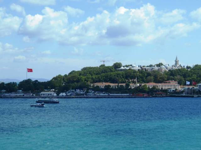 Vom neuen Hafen für Kreuzfahrtschiffe blickt man am unteren Ende des Goldenen Horns über die Bucht auf die drei bedeutendsten Sehenswürdigkeiten – die Hagia Sophia, die Blaue Moschee und den Topkapi-Palast.