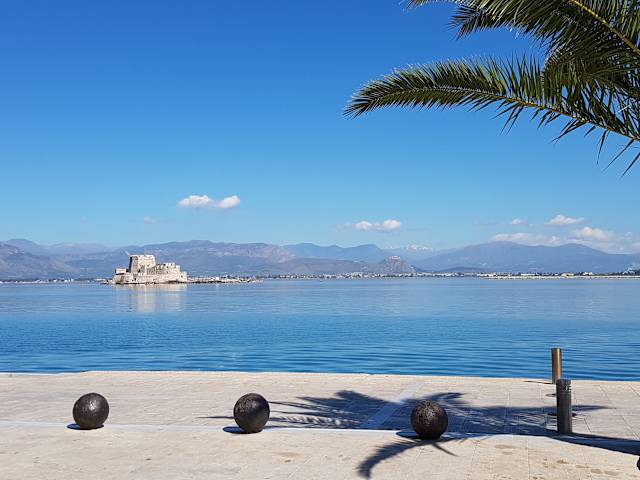 Die Stadt Nauplia am Meer, ist eine kleine saubere Stadt als Fussgängerzone. Schöne schmale Gassen mit Tavernen und Gechäfte laden zum Bummeln ein. Eine originelle Bar ist Lathos Bar-man glaubt nicht in einer Bar zu sein-ÜBERASCHUNG ! Die Burg Palamidi überragt alles.Man kann zu Fuss hinaufgehen ( 999 Stufen ) oder mit dem Auto hinten hinauffahren. Im Meer befindet sich eine kleine Burganlage ( Bourzi ) Nauplia mit seiner Umgebung ist ein Umweg oder eine Besichtigung wert.