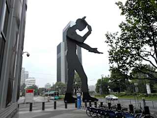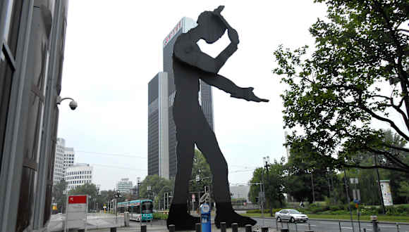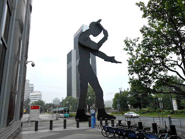 Der "Hammering Man", die etwa 21 Meter hohe Skulptur eines hämmernden Mannes, steht neben dem Messeturm an der Friedrich-Ebert-Anlage im Frankfurter Westend. Das Monument wurde 1991 von dem amerikanischen Künstler Jonathan Borofsky geschaffen und im April 1991, zeitgleich zur neuen Kunstmesse Art Frankfurt, aufgestellt. Dabei handelt es sich um eine etwa 32 Tonnen schwere menschliche Figur aus Stahl, die mittels eines Motors unablässig einen Hammer gegen ein Werkstück schlägt. Die Skulptur symbolisiert den arbeitenden Menschen und den unaufhaltsamen Lauf der Zeit. In verschiedenen Großstädten in aller Welt stehen weitere unterschiedlich große Ausführungen des Hammering Man. Homepage: https://www.kunst-im-oeffentlichen-raum-frankfurt.de/de/page151.html?id=145