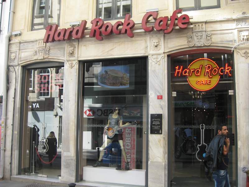 Das Hardrock Cafe findet man in der Meşrutiyet Caddesi No:3.Kommt man vom Taksim Platz geht man die Istikbal Caddessi solange runter bis sie automatisch in die Hamalbasi CD über geht ( Hauptstraße in Galata --- runter zur Galatabrücke ). Auf der rechten Seite auf der Ecke findet man das HRC. Die Außenfront eher etwas unscheinbar, aber im Innenbereich schön eingerichtet. Aber nicht wie man es oft gewohnt ist im Rock Style, sondern eher etwas modern und stylisch . Relativ großer Verkaufsbereich. Speisen und Getränke sowie die Preise wie in jedem HRC. Wurde erst 2014 eröffnet.
