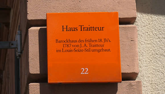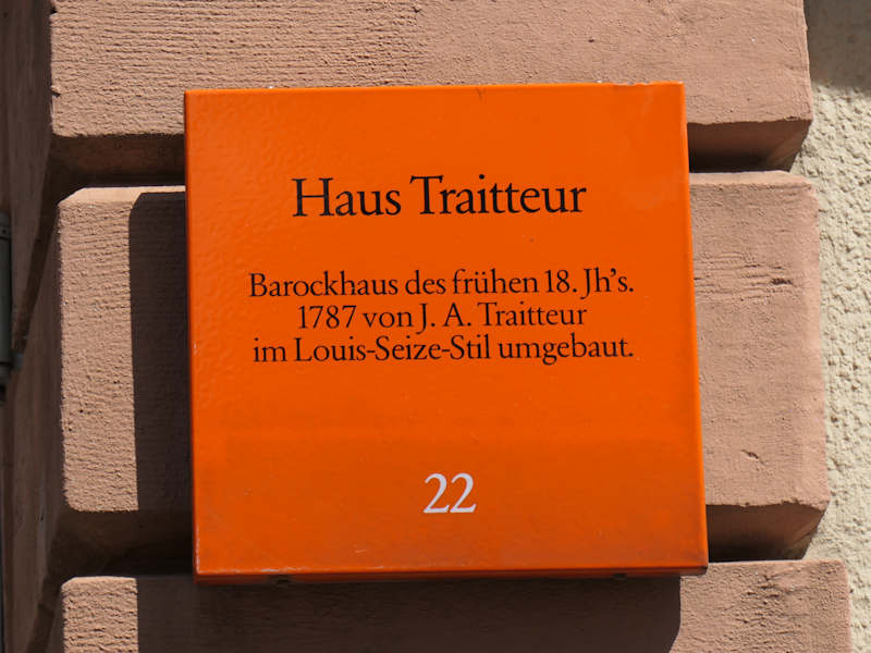 Das Anfang des 18. Jahrhunderts erbaute Haus an der Ecke Fischmarkt/Haspelgasse wurde vom Festungsbaumeister Johann Andreas von Traitteur erworben und ab 1778 zu seinem Wohnhaus umgebaut. Traitteur begann 1790 eine Wasserleitung nach Mannheim zu bauen. Außerdem machte er Versuche mit Heißluftballons. Adresse: Fischmarkt 4, 69117 Heidelberg Webseite: http:// histmath-heidelberg. de/heidelberg/mathrund-www/28. htm Geodaten: CP65+WMW Heidelberg