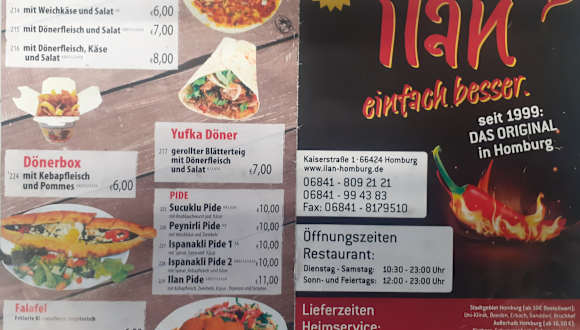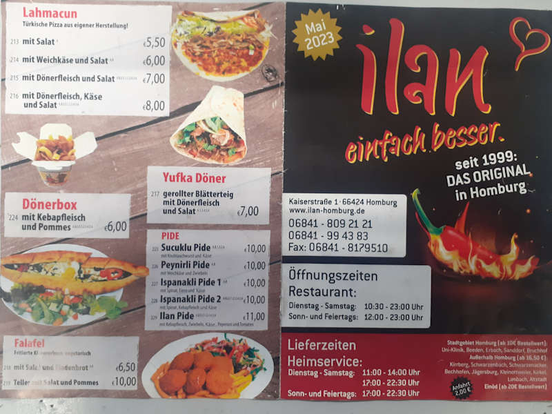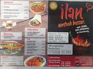 Ich bestellte auf der Arbeit für die Pause hier ein großer Hähnchen Kebap für 6,50,- Euro. Der Kebap war sehr lecker und gut gefüllt zubereitet. Pünktlich wurde das Essen geliefert. Der Fahrer war sehr freundlich und hilfsbereit, Dankeschön. Sehr gerne bestellen wir wieder und empfehlen den Heimservice deshalb klar weiter. Adresse: Heimservice Ilan Grillstube Kaiserstraße 1 D-66424 Homburg Tel.: +49 (0) 6841 994383 Öffnungszeiten: Donnerstag 10:30–22:00 Freitag 10:30–23:30 Samstag 10:30–23:30 Sonntag 12:00–23:00 Montag Geschlossen Dienstag 10:30–23:30 Mittwoch 10:30–23:30