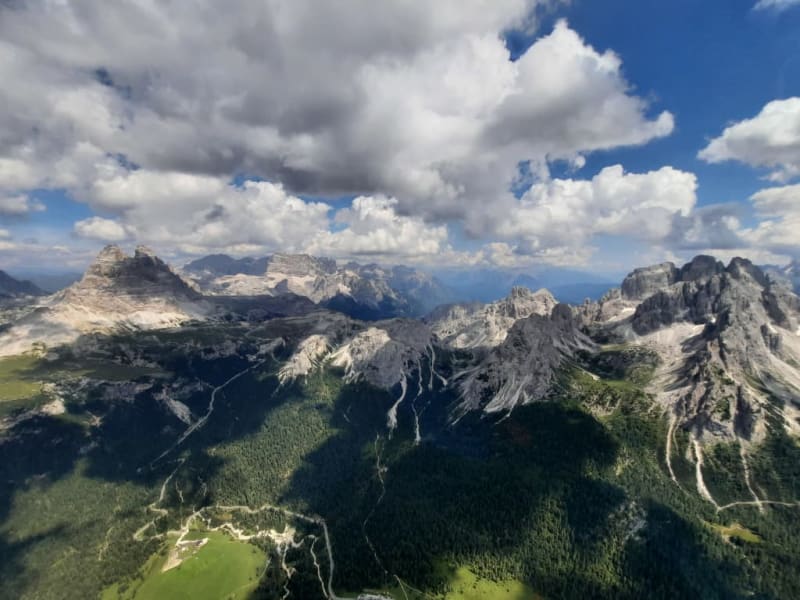 Ich hatte im Vorfeld, als Geschenk, den Heliflug bei Heli Austria gebucht. Es war eine Empfehlung von unserem Hotel in Schenna. Einen Tag vorher bekam ich den genauen Zeitpunkt und zu dem fuhren wir auf den Heliport direkt in Meran. Ich bezahlte in dem kleinen Büro den Preis von 399 Euro pro Person für eine Stunde. Es ist der größte pauschal angebotene Zeitraum für die Dolomiten mit Umrundung der 3 Zinnen. Der Heli kam eine kurze Zeit später und wir konnten ihn schon mal fotografieren wie er landete. Die andren beiden Passagiere und der Pilot gingen in den Heli, Kopfhörer wurden verteilt, die Anschnallgurte überprüft, die Türen geschlossen und der Rotor gestartet. Jetzt geht es erstmal über die Passer und hoch über Meran rüber in die Dolomiten. Der erste uns bekannte und sehr markante Berg war der Schlern. Zu dessen Füssen wir ja im Mai die tolle Ferienwohnung in Seis hatten und ihn jetzt aus der Vogelperspektive bewundern konnten. Und dabei der Blick auf die Seiser Alm ihre volle Größe und schneefrei. Es war ein unbeschreibliche Moment und wir sogen die Bilder in uns auf. Wir flogen ganz ruhig, mit ganz kleinen windbedingten "Wellen" weiter. Absolut nicht unangenehm. Der Pilot fragte uns was wir so alles sehen möchten und erklärte uns die vor uns liegenden Berg und Sehenswürdigkeiten. Wie den Pragser Wildsee und Misurina See. Es beeindruckend die uns bekannten Dinge jetzt aus der Luft zu sehen. Wir flogen meist auf ca 2900 m und hatten eine tolle Sicht. Selbst der Pilot machte während dem Flug Fotos. Wir flogen über verschiedene Hütten und an manchem Gipfelkreuz gab es auch Menschansammlungen. Den Pragser Wildsee haben wir schon öfters besucht und auch umrundet. Diese Perspektive gefiel uns aber auch ausgesprochen gut. Dann kam das Highlight, die 3 Zinnen. Die benötigen auch keine Erklärung, wir kannten sie und haben wir auch schon umrundet. Langsam ging es dann zurück nach Meran mit Blick auf den Ifinger und die Kuhleiten Alm. Es war absolut gigantisch und der Preis von 399 Euro pro Person hat sich absolut gelohnt.