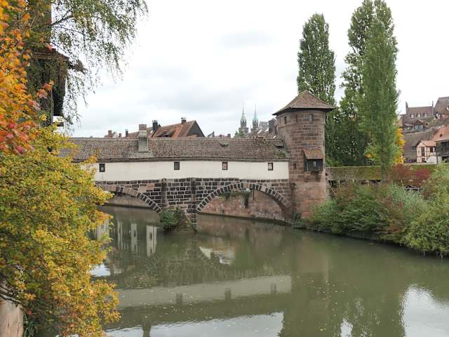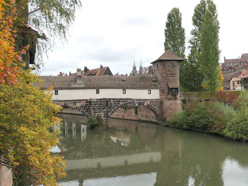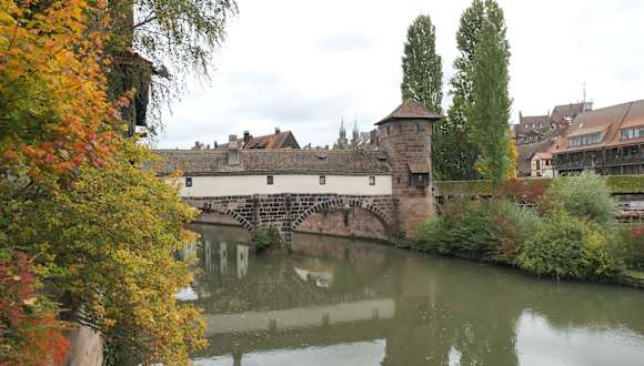 Der Henkerturm auf der Trodelmarktinsel ist über die Henkerbrücke mit der Lorenzer Altstadt und über den Henkersteg mit der Sebalder Altstadt verbunden. Bekannt und beliebt ist das Bild von der Maxbrücke oder auch vom Henkersteg aus mit dem viereckigen Wasserturm (links), der Henkerbrücke (die über einen Seitenarm der Pegnitz führt) und dem kleineren, runden Henkerturm (rechts).