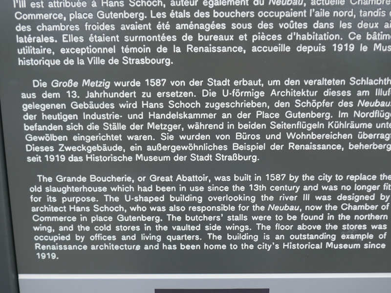Auf der Rue du Vieux - Marché - aux - Poissons steht dieses Gebäude, praktisch an der Brücke der iLL. In diesem Museum erfährt man mehr über die Stadtgeschichte ausgehend vom Mittelalter bis zu Schaffung der europäischen Institutionen. Früher war es ein Schlachthof, es gibt auch eine Erinnerung an das Jahr 1359 als es ein Judenprogrom in Straßburg gab. Es gibt auch einen Gedenkraum an den Jean B. Kléber. Öffnungen: von Dienstag bis Freitag, Mittags eine Stunde Mittagszeit, Sa und So. durchgehend.