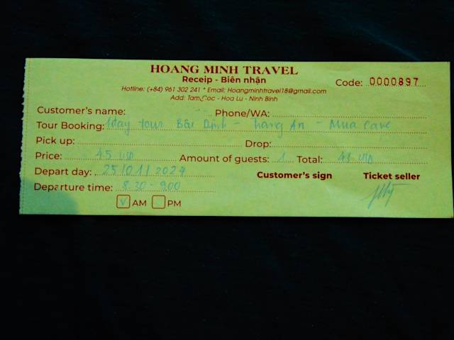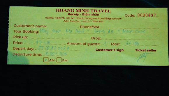 Während meines kurzen Aufenthalts im nordvietnamesischen Tam Coc bei Ninh Binh habe ich sehr gute Erfahrungen gemacht, was den Buchungsvorgang, die Schnelligkeit der Buchung und auch das profunde Programm angeht (inkl. guter Organisation, freundlicher Guides und guter Autos). Ich hatte nur zwei Tage vor Ort und hatte gleich am Ankunftstag in Tam Coc für den Folgetag einen ca. 8stündigen Ausflug in einer Kleingruppe (von ca. 20 Leuten) zum Pagodenkomplex Bai Dinh, eine Ruderbootfahrt durch Trang An und eine Besichtigungstour inkl. "Trekking" zu den Mua Caves für insgesamt 45 USD gebucht. Ich wurde definitiv nicht enttäuscht. Die Beratung für diese Tour fand sehr freundlich und in gutem Englisch statt. Die Bezahlung hatte ich per Kreditkarte vornehmen lassen. (knapp 3% höher wegen der Kartenprovision) Ich kann eine Buchung über Hoang Minh Travel nur empfehlen und werde wieder über dieses Reisebüro buchen, wenn ich höchstwahrscheinlich gegen Ende des Jahres 2024 wieder in Nordvietnam sein werde. Hier die Kontaktdaten: Hoang Minh Travel Tam Coc Tel. +84 961 302 241 Email: hoangminhtravel18 @ gmail. com