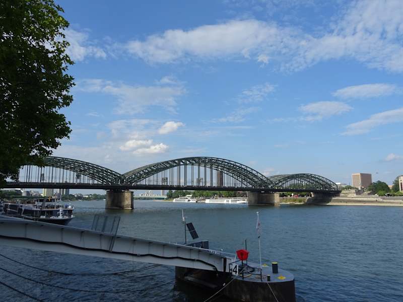 Die Fußgänger- und Eisenbahnbrücke ist ein fester Bestandteil des Stadtbildes von Köln. Mit 1220 Zugfahrten pro Tag ist sie die meistbefahrene Eisenbahnbrücke Deutschlands. Ein schöner Anblilck vom Rheinufer aus.