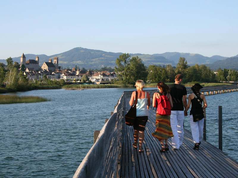 Die Wanderung über den 841m langen Holzsteg zwischen Rapperswil und Hurden wurde 2001 gebaut und war einst ein Teil des Jakobswegs. Bei einer Wanderung über die Brücke hat man fantastische Aussichten auf die Landschaft und Wasservögel im umliegenden Schilf.