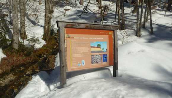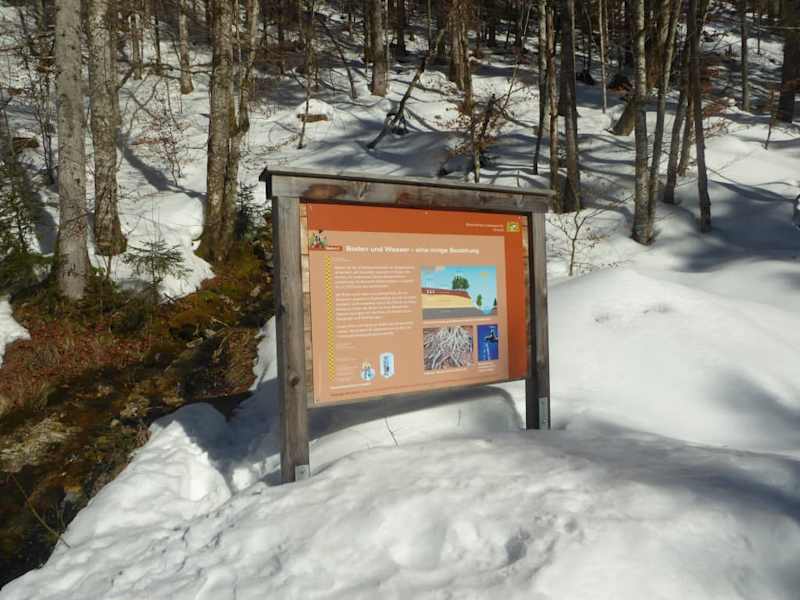 Es gibt sogenannte „Schneelöcher“ in Bayern, da schneit es traditionell zwei und dreimal so viel, wie woanders. So ein Gebiet ist die Gegend im bayrischen Oberland zwischen Kreuth und den Achenpass. Aus diesem Grund fuhren wir nach Kreuth um noch im Monat März eine Winterwanderung zu einer Almwirtschaft machen zu können.. Der Ausgangspunkt unserer Winterwanderung war der Parkplatz Winterstube etwa 4 km von Kreuth entfernt. Die Parkgebühren fallen in der Zeit von 8 bis 18 Uhr an. Da wir über 3 Stunden unterwegs waren, bezahlten wir 5,00 Euro. Der Parkautomat nimmt nur Münzen entgegen. Beim Parkplatz befanden sich einige Informationstafeln für Wanderungen im Umfeld von Kreuth. Interessant fand ich die Informationstafel Kreuth Klamm Nord. Auf einer Hinweistafel am Rande des Parkplatzes waren auch die Öffnungszeiten der Tegernseer Hütte, Buchsteinhütte und Schwarzentenn Alm vermerkt. Die Schwarzentenn Alm hatte am 1.März (Faschingsdienstag) geöffnet. Laut eines Wegweisers beim Parkplatz sollte man eine Gehzeit von 1 ¼ Stunden zur Schwarzentenn Alm einplanen. In der Winterzeit mit verschneiten und teilweisen glatten Wegen war diese Zeit natürlich nicht einzuhalten. Es gibt zwei Wege zur Schwarzentenn Alm, eine Forststraße und einen schmalen Steig entlang des Schwarzenbaches. Beide Wege dauern ungefähr gleich lang. Für den Aufstieg haben wir uns für den landschaftlich schöneren Steig und für den Abstieg für die Forststraße, entschieden. Kurz nach dem Parkplatz haben wir bereits die Schuh-Spikes angelegt. Wir wollten kein Risiko eingehen. Der Wanderweg verlief immer links vom Bach entlang. Wir passierten einige nicht von Schnee geräumten Brücken und kurz vor dem Ende des Pfades kamen wir auch an einen kleinen Wasserfall vorbei. Der Schwarzenbach zeigte sich hier in seiner schönsten winterlichen Seite.Der Schnee hat viele Steine mit kugeligen Kapuzen bedeckt, es sieht teilweise aus wie eine Anhäufung von Riesenpilzen. Interessant fanden wir die Infotafeln entlang des Steiges, wie z.B. Steile Hänge,bedrohte Böden oder Schutzwald. Hier konnte man sehr viel Wissenswertes über die Böden und den Schutzwald nachlesen. Ein gesunder Boden ist die Grundlage für das Wachstum von Pflanzen und für einen intakten Bergwald. Schön fand ich auch eine kleine farbige Hinweistafel an einer Felsenwand mit den Namen Buchenwand. Hier war zu lesen, dass die Buchenwand, aus harten Oberräthkalk besteht, ebenso wie die markanten Gipfel Leonhardstein und Buchstein. Eiszapfen hingen von einem Felsvorsprung herab und schufen hier ein zerbrechliches, schmelzendes Kunstwerk der Natur. Beim Abzweig zum Buchstein waren es nur noch geschätzte 15 Minuten zur Schwarzentenn Alm. Die Almwirtschaft liegt in einer landschaftlichen traumhaften Schneelandschaft. Vor dem Berggasthof türmten sich riesige Schneehaufen. Da es nur wenige Sitzplätze im Freien gab, suchten wir uns einen Platz in der Gaststube. Zuerst mussten wir aber unseren Impfnachweis vorlegen, Die Corona Bestimmungen wurden in der Schwarzentenn Alm sehr gewissenhaft eingehalten. Wir suchten uns einen gemütlichen Ecktisch. Die freundliche Almwirtin brachte uns sofort die Speise- und Getränkekarte. Das Speiseangebot der Almwirtschaft war zwar sehr klein, doch für unseren Hunger ausreichend. Wir bestellten uns, 1 Portion Tellerfleisch mit Kartoffelsalat (11,00 Euro) und Wildbratwürste mit Kartoffelsalat (8,50 Euro), dazu je ein Weißbier (3,90 Euro). Das Essen und die Getränke wurden uns in kurzer Zeit gebracht. Das Tellerfleisch mit Kartoffelsalat war hervorragend. Selten so ein gutes Tellerfleisch gegessen. Wir waren fast 2 Stunden in der Almwirtschaft. Zum Abschied schenkte mir die Almwirtin noch eine Postkarte von der verschneiten Schwarzentenn Alm. Hier in der Almwirtschaft können sich die Wanderer mit traditioneller guter bayrischer Küche stärken. Vor der Schwarztenn Alm versuchte eine Schneefräse die Schneeberge zu beseitigen. Ein mühsamer Kampf gegen den Schnee. Nun machten wir uns auf den Rückweg zum Parkplatz. Diesmal ging es auf den Forstweg zurück, Unterwegs kamen uns mehrere Wanderer mit Schlitten entgegen. Auch vereinzelt fuhren Skifahrer die Forststraße hinunter. Unterwegs kamen wir auch bei einigen Hinweistafeln vom Bayrischen Landesamt für Umwelt vorbei. Auf einer Tafel wurde erklärt, wie es vom See zum Moor gekommen ist. Eine Warntafel an einem Baum wies darauf hin; Fußgänger,Radfahrer und Skifahrer bitte auf Kfz-Verkehr achten! Auf dem Rückweg von der Schwarzentenn Alm findet man in einer kleinen Lichtung, auch eine Reihe von aufgestellten Holzfiguren. Diese wurden laut einer Beschreibung im Internet mit einer Kettensäge hergestellt. Da hat sich der Künstler sehr viel Arbeit gemacht. Es ist auf jeden Fall empfehlenswert einen genaueren Blick auf die Figuren zu werfen. Zuletzt kamen wir noch bei einer weiteren Hinweistafel vom Bayrischen Landesamt für Umwelt (Station 3) vorbei. Auf dieser Tafel wurde erklärt, wie Boden und Wasser eine innige Beziehung haben. Wasser ist hier im Schwarzbachtal allgegenwärtig, ob als Bach, als Wasserfall, unsichtbar im Boden oder wie hier als Quellwasser. Seinen Wasserreichtum verdankt das Tal den hohen Niederschlägen mit jährlich bis zu 2500 Litern pro Quadratmeter. Anschließend waren es nur noch einige Minuten bis zum Parkplatz. Eine tolle Winterwanderung im Monat März.