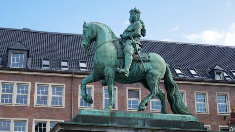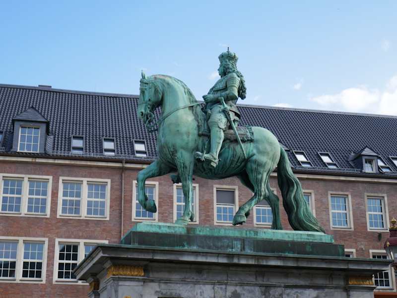 „Jan Wellem“ oder korrekt: „Johann Wilhelm II., Kurfürst von der Pfalz, Herzog von Jülich-Berg, Pfalzgraf zu Neuburg“ regierte von 1679 bis 1716 und wird noch heute in Düsseldorf geliebt: Jan Wellem förderte nämlich seine Geburtsstadt außerordentlich, baute ein Opernhaus, unterstützte Maler und Musiker, begünstigte das Handwerk, ließ Straßen bauen und kümmerte sich um die Belange der Bevölkerung. In einer bislang unbekannten Liberalität durften Protestanten erstmals Kirchen in der Stadt errichten und auch die jüdische Gemeinde baute ihre erste Synagoge in Düsseldorf. Von Jan Wellems Bauwerken ist inzwischen nichts mehr erhalten und nur das Reiterstandbild auf dem Marktplatz vor dem Rathaus erinnert an den Kurfürsten: Auf dem trabenden Pferd sitzt Jan Wellem in voller Rüstung, mit Kurhut, Ordenskette und Marschallstab – erschaffen wurde das Werk noch zu Lebzeiten des Fürsten von dem italienisch-flämischen Bildhauer Gabriel Grupello.