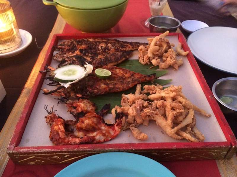 Besonders hervorzuheben ist die Lage des Restaurants direkt am Strand. Die Tische stehen im Sand nur wenige Schritte vom Meer entfernt. Toll ist die Stimmung besonders bei Sonnenuntergang. Um einen Tisch in vorderster Reihe zu bekommen sollte man ca. eine halbe Stunde vorher dort sein. Das Restaurant bietet frischen Fisch, Hummer, Garnelen und andere Meeresfrüchte, die man vor der Zubereitung selber in Augenschein nimmt bevor sie dann über offenem Feuer gegrillt werden. Die Preise richten sich dabei nach Gewicht (z. B. 100g Red Snapper - sehr zu empfehlen - knapp 1 EUR). Auf Wunsch kann man sich kostenlos zum Restaurant bringen und auch wieder nach Hause fahren lassen, Anruf genügt: 0361 / 701517 oder 703940.