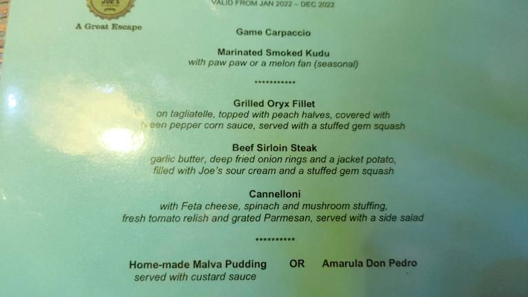 Joes Beerhouse ist fast ein Muss. Es gibt eine riesige Speisekarte, mit jeder Menge Auswahl an Fleischsorten. Es wird bildlich erklärt welches Fleisch auf dem Teller liegt, wenn man sich zum Beispiel ein Fleischspieß mit Zebra, Springbock, Kudu, Krokodil und Oryx bestellt. Der Biergarten ist sehr schön angelegt, man kann aber auch innen sitzen. Eine Tischreservierung sollte unbedingt vorgenommen werden. Das Essen sehr lecker!!!