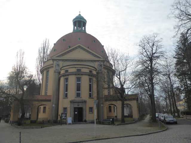 Bei unserem Spaziergang in Berlin-Lichterfelde kamen wir auch bei der evangelischen Johanneskirche vorbei. Die Kirche befindet sich in der Ring-/Ecke Pfleidererstrasse. Die Besiedelung Lichterfeldes in der Region der heutigen Johannes-Kirchengemeinde begann Ende des 19. Jahrhunderts. Die Grenzen der Johannes-Kirchengemeinde haben sich jedoch in den letzten Jahrzehnten mehrmals verändert. Im Jahr 1920 bei der Bildung von Groß-Berlin, wurde Lichterfelde ein Ortsteil des Bezirkes Steglitz. Die Grundsteinlegung der denkmalgeschützten Kirche erfolgte am 1.Mai 1913 und am 2.November 1914 wurde die Kirche eingeweiht. Die Kirche wurde nach einem Entwurf von Otto Kuhlmann (1873 - 1948) errichtet. Der bekannte Architekt Otto Kuhlmann erhielt im Jahr 1918 den Ehrentitel Geheimer Hofbaurat. Eine Besonderheit der Kirche ist, dass sich der Kirchensaal im Obergeschoss befindet. Der Architekt Otto Kuhlmann hat wegen des engen Bauplatzes den Gemeindesaal mit Bühne und Nebenräumen in das ebenerdige Sockelgeschoss verlegt. Die Kosten für die Kirche betrug damals 240000 Mark, wovon die Kirchengemeinde für den Saal im Untergeschoss 40000 Mark aufbringen musste. Über dem Hauptportal am Treppenhaus befindet sich ein Medaillon mit dem Kopf des Johannes, dem die Kirche geweiht ist. Besonders schön fand ich die drei Fresken am Eingang des Kirchenraums. Die drei Fresken stammen von der berühmten Malerin Ursula Kükental um 1942. Sehr modern und interessant fand ich das Bild über den Altar in der Kirche. Der kreisförmige Grundriss der Kirche hat im Kirchenraum einen Durchmesser von 20 Meter. Statt Kirchenbänke wurden Stühle bei der architektonischen Veränderung in der Jahren 1964 bis 1965 in der Johanneskirche aufgestellt. Dabei wurde auch die Orgel wurde vom Platz über dem Alter auf die gegenüberliegende Seite verlegt. Im Jahr 1990 wurde der Innenraum der Kirche renoviert, zum Teil im Original-Farbton, und er erhielt eine neue Zentral-Leuchte. Bekannt ist die Johanneskirche auch wegen ihrer kirchenmusikalischen Veranstaltungen. Der Eintritt zu den Veranstaltungen ist laut eines Kirchenprospektes frei. Die Johannesgemeinde finanziert die Konzertreihe über Spenden und Kollekten, die am Ende der Veranstaltungen eingesammelt werden. Die heute unter Denkmalschutz stehende Kirche zeigt Elemente verschiedener Stilepochen. So ist Klassizismus, Barock und die beginnende Moderne zu erkennen. Eine interessante Kirche in Berlin-Lichterfelde.