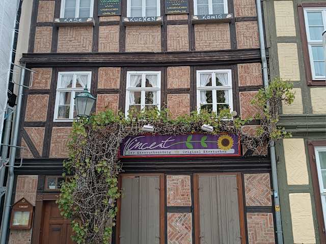 Die auffallende Werbung des selbsternannten Käsekuchenkönigs auf dem Quedlinburger Schlossplatz ist meines Erachtens ein wenig zu viel des Guten! Der Inhaber spürt anscheinend die Konkurrenz des gegenüberliegenden zweiten Schlossplatzcafes welches ebenfalls Käsekuchenvariationen anbietet. Im Inneren der Bäckerei/Cafe Vincent hat man die Auswahl zwischen 15-18 verschiedenen Käsekuchen welche in einer Vitrine betrachtet werden können. Eine Preisangabe sucht man jedoch vergebens. Ebensowenig finden sich die Käsekuchenvariationen auf der Speisen- und Getränkekarte. Vor der Bäckerei ist eine Aussenbestuhlung mit großen Sonnenschirmen. Im Inneren des Gebäudes erreicht man über eine steile schmale Treppe einen alten Raum mit mehreren kleinen Tischchen. Die Toiletten befinden sich im Keller welcher über eine alte Steintreppe erreichbar sind. Für Gehbehinderte nicht geeignet! Bei unserem Aufenthalt waren beide Bedienungen eindeutig überfordert. Der so heftig als „Geschmackskrönung“ beworbene und angepriesene Käsekuchen kann aus meiner Sicht so nicht bestätigt werden. Ich habe schon geschmacklich bessere Käsekuchen gegessen. Eine Reisetipp für ein unbedingt "besuchen müssen" kann ich leider nicht erkennen.