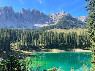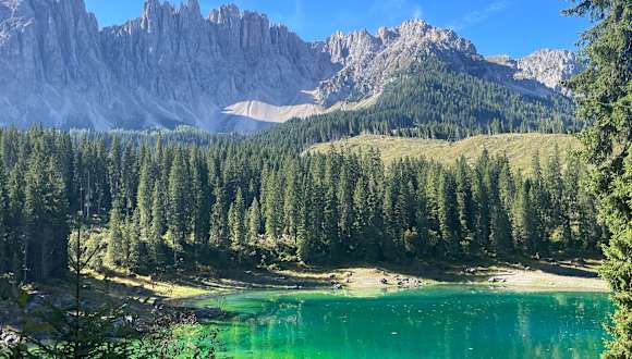 Er ist einer der schönsten Bergseen der Alpen: Der sagenumwobene Karersee. Sein Ufer ist gesäumt von dunklem Wald, in seinem klaren Wasser spiegeln sich die schroffen Wände des Latemar. Kein Wunder, dass die Kaiserin Elisabeth hier gerne spazieren ging. Ihr Lieblingsweg ist am See ausgeschildert. Berühmt ist auch das Farbenspiel des Karersees, das der Legende nach entstand, als eine Seejungfrau einen Regenbogen fangen und ins Wasser ziehen konnte. Verfasst von HolidayCheck