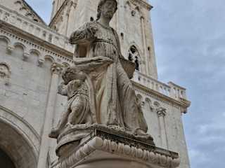 Die Sveti Lovro steht auf dem Hauptplatz von Trogir - nur ca. 50 m hinter dem Landtor. Das unter einer Vorhalle etwas versteckte Portal lädt sofort zum Fotographieren ein, denn über den "wachenden Löwen" befinden sich Statuen von Adam und Eva, nur mit einem Feigenblatt bekleidet - sehr selten zu finden in einer so alten Kathedrale (Bauzeit 12. - 17. J.). Diesem "hemmungslosen" Fotographieren aber wird ein Riegel vorgeschoben, indem man (außer zur Zeit der Messe am Sonntag) in den Eingang der Vorhalle einen Tisch gestellt hat, an dem zuerst 25 Kuna Eintritt gezahlt werden müssen. Das fand ich unschön. Allerdings ist es möglich, dass schöne Portal durch ein Gitter hindurch abzulichten. Kunstschätze in der Kathedrale: die achteckige Steinkanzel und das geschnitzte Chorgestühl. Weiterhin: die angebaute Kapelle Sveti Ivan Ursini (dem ersten Bischof Trogirs geweiht).