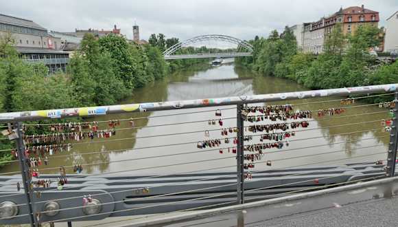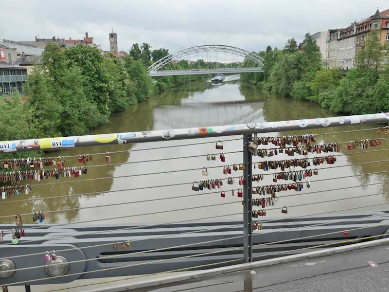 Die Brücke über die Regnitz liegt innerhalb des Gebietes, das zum UNESCO Weltkulturerbe gehört. Insofern gab es beim Bau der Brücke im Jahr 2009 sicher Auflagen hinsichtlich der Gestaltung, als die alte Brücke aus dem 19. Jahrhundert ersetzt werden musste. Die dabei entstandene moderne Version der Vorgängerbrücke scheint zumindest bei den Verliebten Anklang zu finden, die hier ihre Liebesschlösser anbringen.