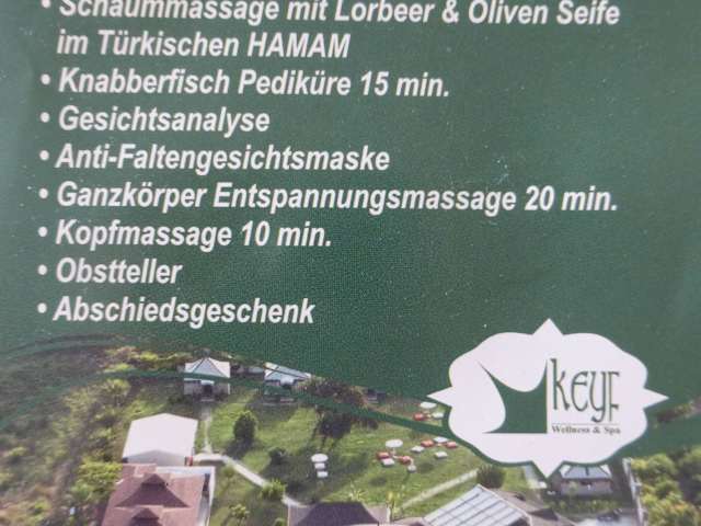 In unserem Clup erwartet Sie hoher Komfort zum Wohlfühlen,Entspannen und Relaxen.Setzen Sie ihren eigenen Körper in den Mittelpunkt des Tages und geniessen Sie traumhafte Wellnessbehandlungen aus aller Welt.Nach der Hamambehandlung werden Sie sich wie neu geboren fühlen. Wir bieten ab 15 € verschiedene Wellnesspackete an. Auf wunsch bieten wir kostenlose Transfer an. So finden Sie uns:Von zweite Colakli Kreisverkehr Richtung Meer abbiegen >vor der blauen Moschee rechts abbiegen>Keyf Spa & Hamam Schild führt Sie zu Oase... Die Öffnungszeiten von 9 Uhr bis 20 Uhr von Montag - Sonntag ---Kein Ruhetag ! Üçtepeler mah.istiklal cad.no:11 Çolakli Reception: +902427638814 +902427638815 +905059620600 (Ansprechpartner Herr Kenan Çelikkol) Fax: +902427638816 Homepage: www.keyf-wellness.com E-mail: info@keyf-wellness.com