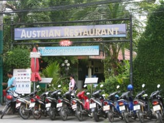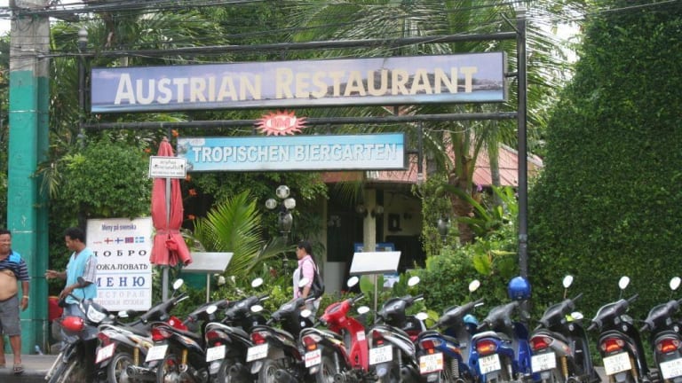 Der Biergarten des K- Hotel liegt an einer sehr stark befahrenen Strasse, trotzdem dringt so gut wie kein Lärm in die Anlage. Unter beleuchteten Palmen gibt es verschiedene Sitzgruppen so das sich jeder einen Platz nach seinem Geschmack suchen kann. Die Location wird von vielen Deutschen u. Östereichern besucht. Die Speisekarte ist lang u. vielseitig. Der Chef, ich habe seinen Namen vergessen, geht auch zu den Gästen und fragt ob die Speisen in Ordnung sind, und die sind sehr lecker! Ich hatte ein Jägerschnitzel und die Pilzsoße dazu war einfach traumhaft! Ich weiss nicht wo der Mann die Pilze bekommen hat, aber es war keine Dosenware.