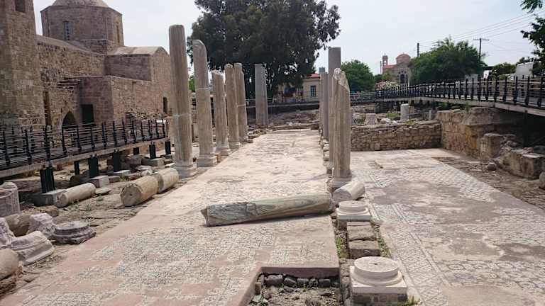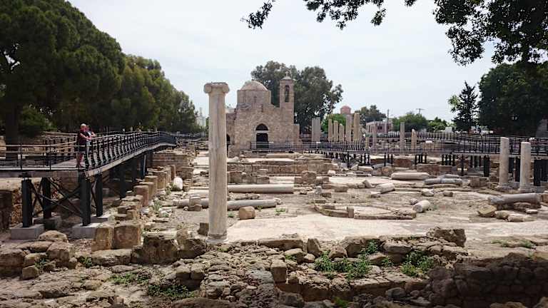 Während man sich im April 2009 fast völlig frei auf dem Gelände der Chrysopolitissa bewegen konnte - und ich dabei wunderschöne Steintafeln mit Wappen, usw. fand und photographierte -, war das Gelände nach in der Zwischenzeit fortgeschrittener Wiederherstellung der Stätte nun im April 2011 nicht mehr voll für den Publikumsverkehr zugänglich. Ob es sich dabei um eine nur vorübergehende Einschränkung während der Osterwoche handelt, kann ich leider nicht sagen. Ich könnte mir aber vorstellen, dass zum Schutz der Stätte (z. B. der frei gelegten Mosaiken) eine gewisse Abtrennung bestehen bleiben könnte. Wirklich einschränkend ist / wäre dies nicht, denn die Wege um das Gelände herum sind derart gut angelegt, dass man einen sehr guten Ausblick aus immer noch nächster Nähe auf die Wiederherstellungsarbeiten hat (siehe anliegendes Video). So kann man an vielen Stellen die schönen Mosaiken bewundern, die sich teilweise und gut einzusehen auch hinter der Agia Kyriaki befinden. Man sollte sich demzufolge nicht mit der Betrachtung der Paulussäule und der Agia Kyriaki begnügen, sondern in aller Ruhe einmal um die Letztere herumwandern. Über die Geschichte der Chrysopolitissa habe ich in meiner Bewertung von 2009 geschrieben und mein Vorbewerter wiederum berichtet ausführlich von der Paulussäule. Um hier nichts zu wiederholen, möchte ich den Leser bitten, bezüglich Informationen zur Geschichte der Chrysopolitissa die beiden vorausgehenden Bewertungen zu lesen. Erwähnen möchte ich noch den Besuch des Papstes Benedikt XVI. am 4.6.2010 in der Agia Kiriaki Chrysopolitissa. Im Verlauf des ökumenischen Gottesdienstes verwies Benedikt XVI. in seiner Ansprache auf die Missionsreise und den Aufenthalt des Apostel Paulus in Paphos. Hier ein Ausschnitt aus der Ansprache des Papstes: "Es ist in der Tat eine außerordentliche Gnade, uns hier in der Kirche Agia Kyriaki Chrysopolitissa zum Gebet zu versammeln. Wir haben soeben eine Lesung aus der Apostelgeschichte gehört, die uns in Erinnerung ruft, daß Zypern die erste Station auf den Missionsreisen des Apostels Paulus war (vgl. Apg 13,1-4). Vom Heiligen Geist erwählt, kam Paulus in Begleitung von Barnabas, der aus Zypern stammte, und Markus, dem späteren Evangelisten, zunächst nach Salamis, wo sie begannen, das Wort Gottes in den Synagogen zu verkündigen. Sie durchzogen die Insel und gelangten nach Paphos, wo sie, ganz in der Nähe von hier, in Gegenwart des römischen Prokonsuls Sergius Paulus predigten. Das bedeutet: Von hier aus begann die Botschaft des Evangeliums sich über das ganze Römische Reich auszubreiten,..."