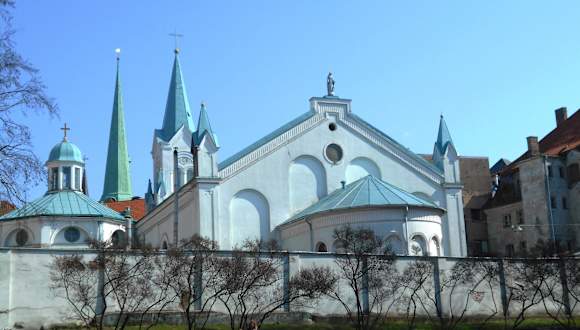 Die Kirche der Schmerzhaften Maria (Sāpju Dievmātes baznīca) wurde 1785 im pseudoromanischen Stil erbaut. Es war die erste katholische Kirche, die nach dem Einzug der Reformation in Lettland gebaut wurde. Vorausgegangen war die im Jahr 1710 von der Regierung des Russischen Reiches den Katholiken gewährte Religionsfreiheit und 1780 ein Besuch des Kaisers des Heiligen Römischen Reiches, Josef II., der sich bei der Zarin Katharina II. für den Bau der Kirche einsetzte, die dann zum Teil aus Spenden des Kaisers und seiner Mutter Maria Teresa finanziert wurde. 1885 wurde die Kirche um ein achteckiges Baptisterium erweitert. Die weiß leuchtende Kirche ist ein Blickfang direkt neben dem Rigaer Schloss am Ufer der Daugava.
